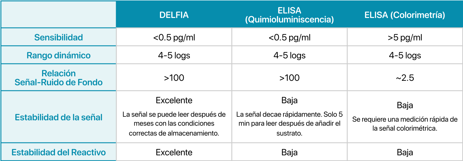 Sin embargo, a diferencia de la prueba de ELISA que utiliza a la enzima peroxidasa para generar una reacción colorimétrica medible, DELFIA® utiliza lantánidos de europio cuya señal de fluorescencia es mucho más estable e intensa. Además, debido a su naturaleza no enzimática, no es susceptible a la degradación.