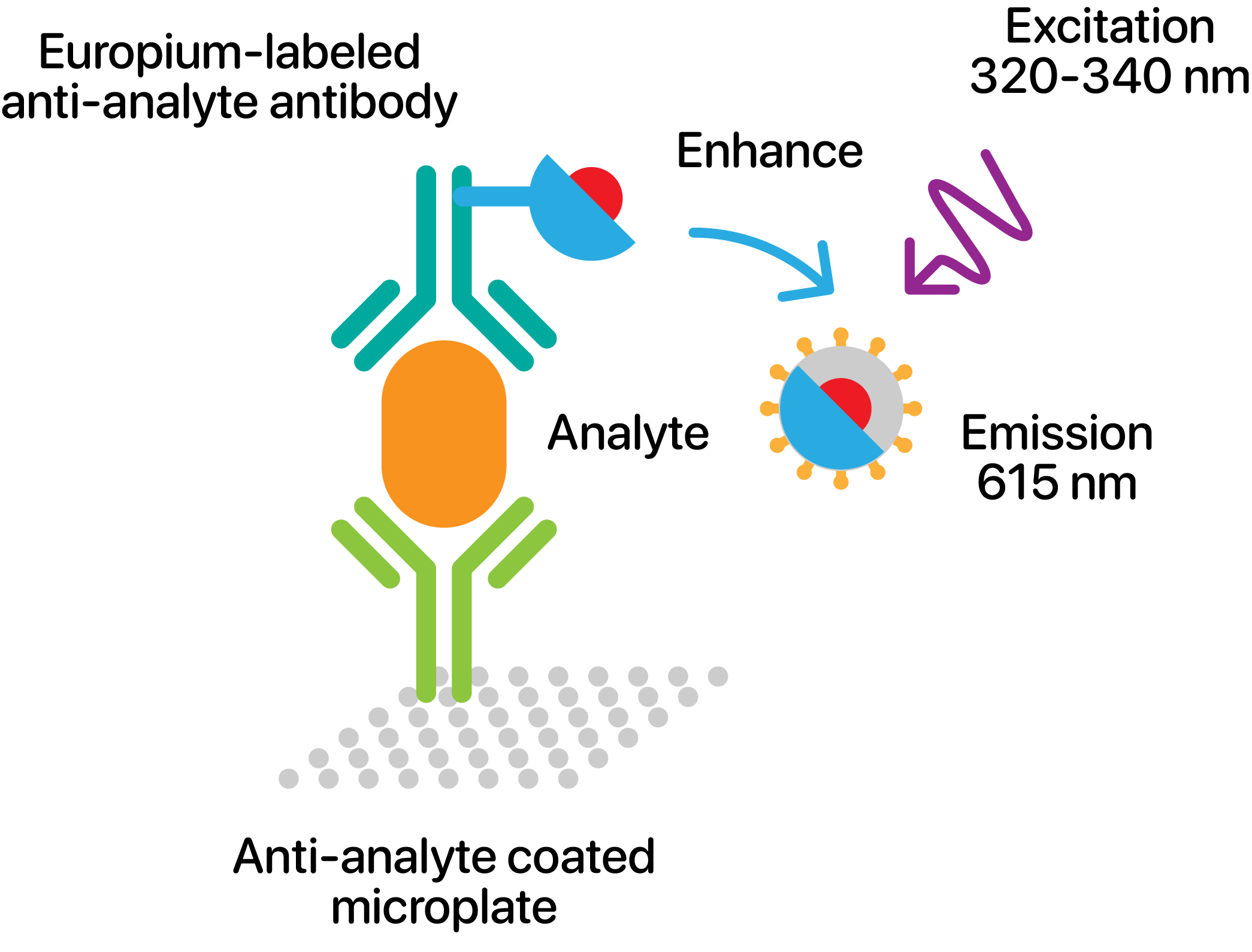 El protocolo de DELFIA® es muy similar al de una prueba de ELISA convencional. El anticuerpo es capturado en una microplaca, seguido de la adición de la muestra y, posteriormente, del anticuerpo de detección, lo que representa un ensayo sándwich típico.