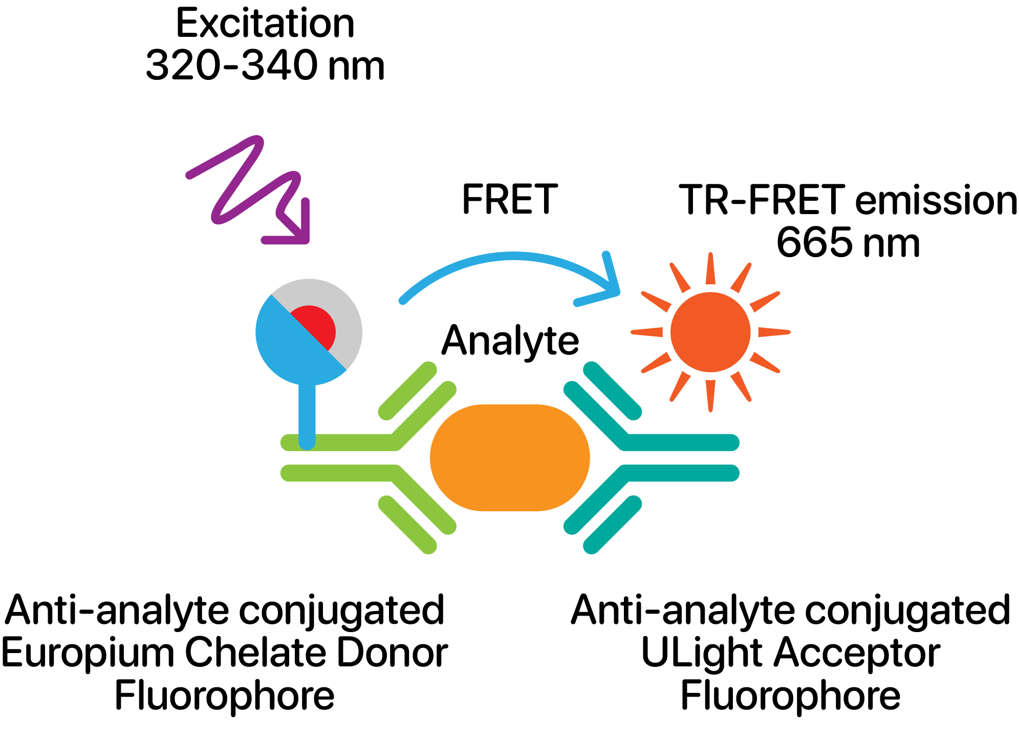 Para que esta energía no sea liberada al medio y sea absorbida, el espectro de emisión de la molécula donadora y el espectro de excitación de la molécula aceptora deben traslaparse. De esta manera, la molécula aceptora es excitada y emite una señal fluorescente que es medida finalmente por el equipo.